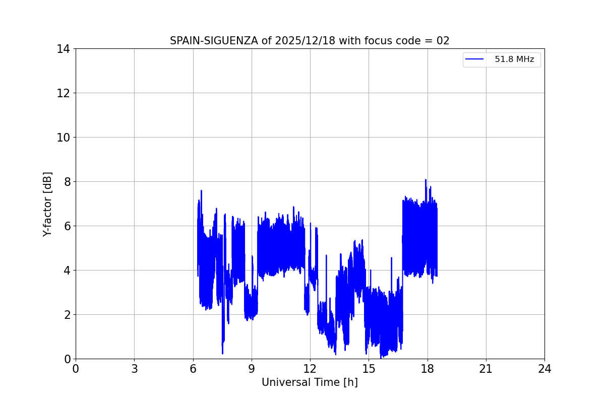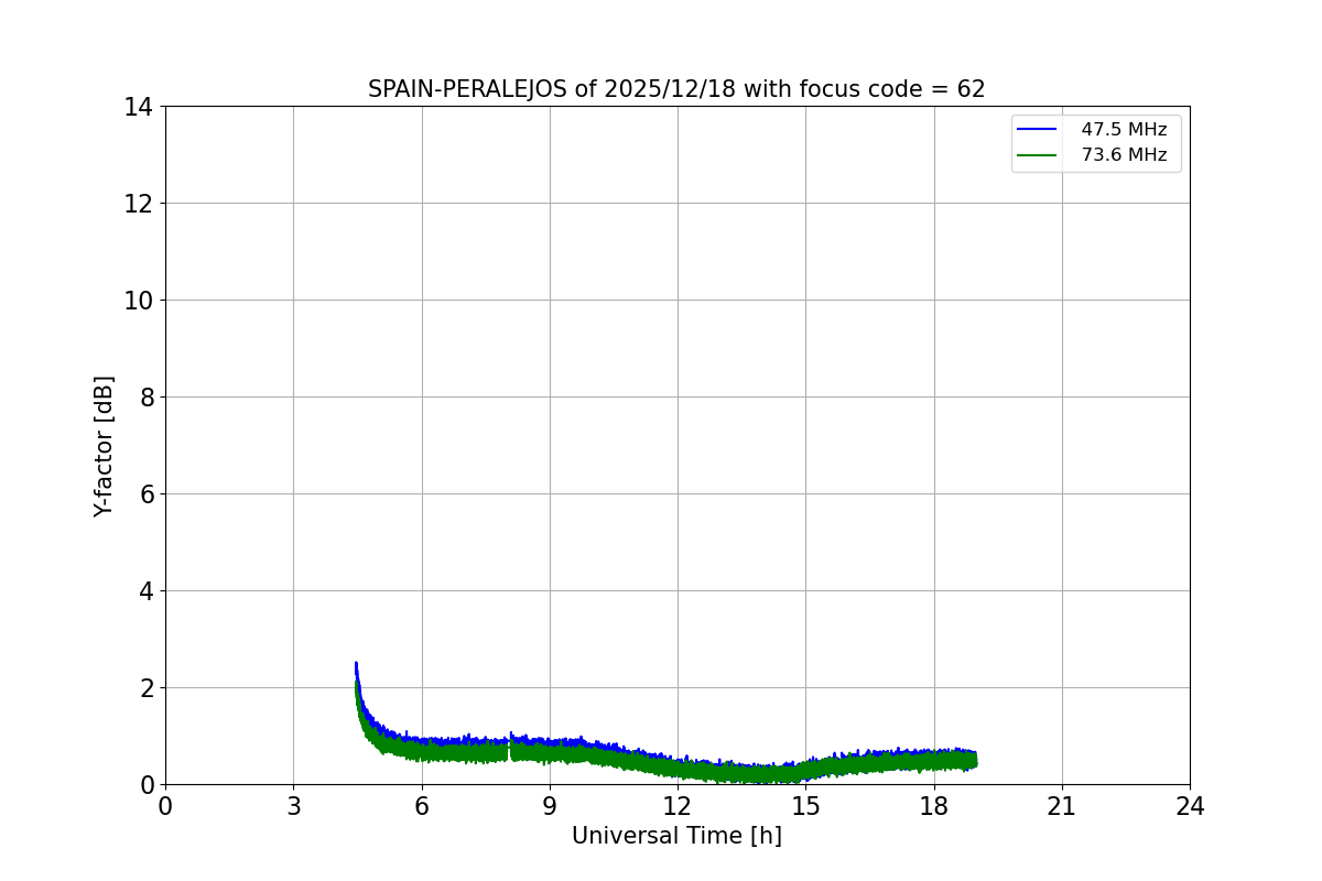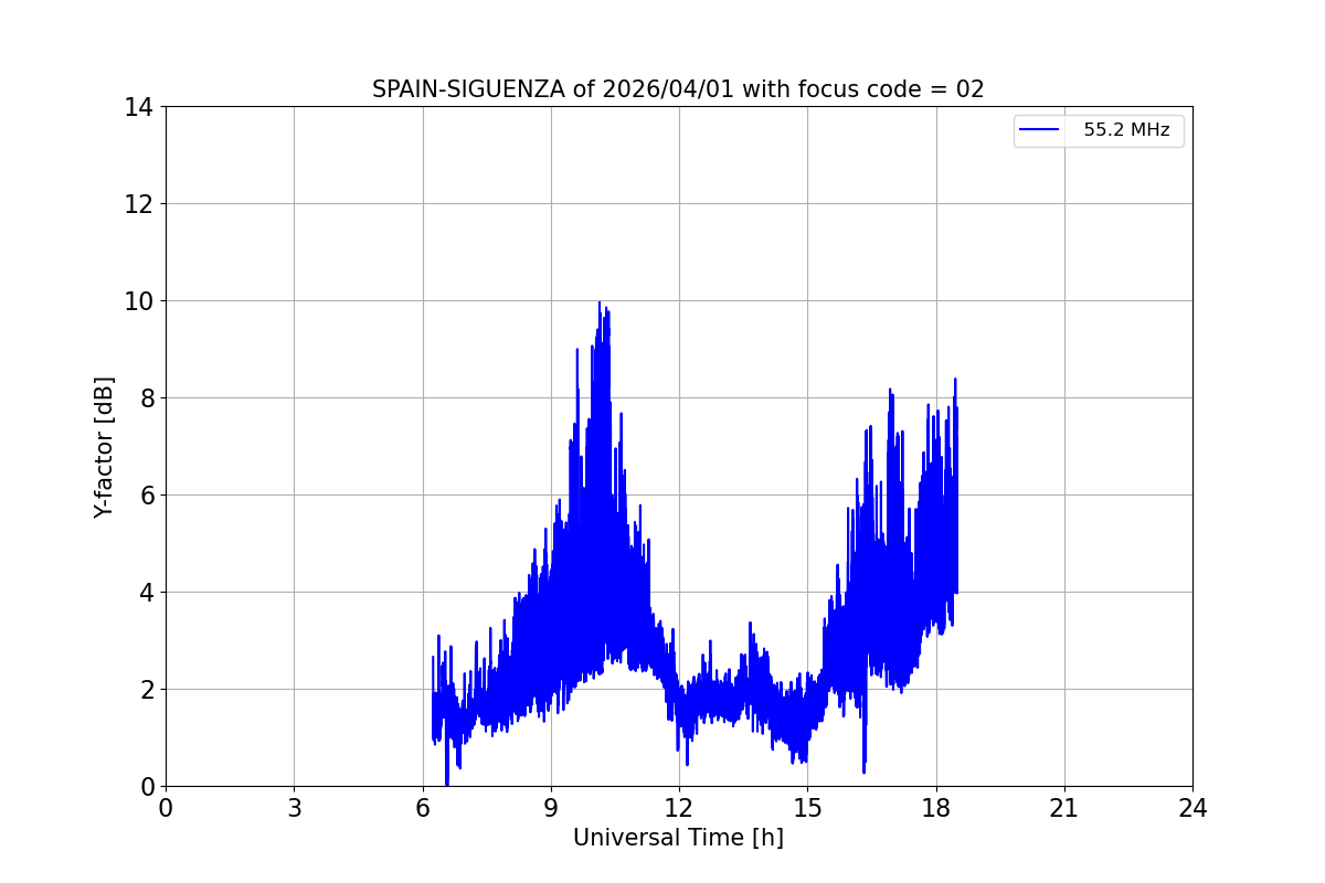 Data from the e-Callisto network radio telescopes is available in http://soleil.i4ds.ch/solarradio/callistoQuicklooks/. The data provided by celestina nodes can be found by searching for SPAIN-ALCALA, SPAIN-PERALEJOS and SPAIN-SIGUENZA. Light curves can be found be found in http://soleil.i4ds.ch/solarradio/data/Lightcurves/. Below are the most recent light curves of CELESTINA nodes. In general, solar radio bursts have a Y-factor of 3 dB, so the level of interference at the radio telescope location must be below 3 dB in order to detect them. The province of Guadalajara offers such unique places, not only for its heritage or natural beauty, but for its low level of electromagnetic pollution.